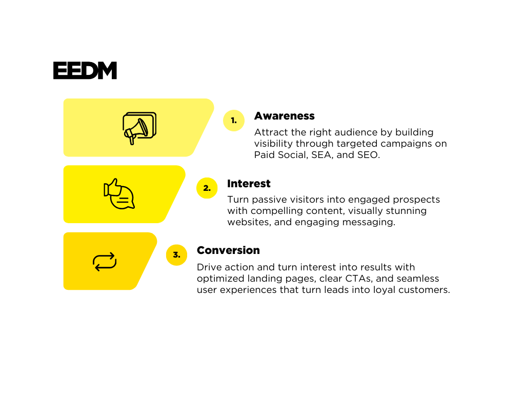 Your funnel is more than a process — it’s the journey that transforms visitors into customers and customers into advocates. At EEDM, I bring creativity and strategy to every step, building awareness, sparking interest, and driving meaningful conversions. Let’s craft a funnel that doesn’t just work — it excels.